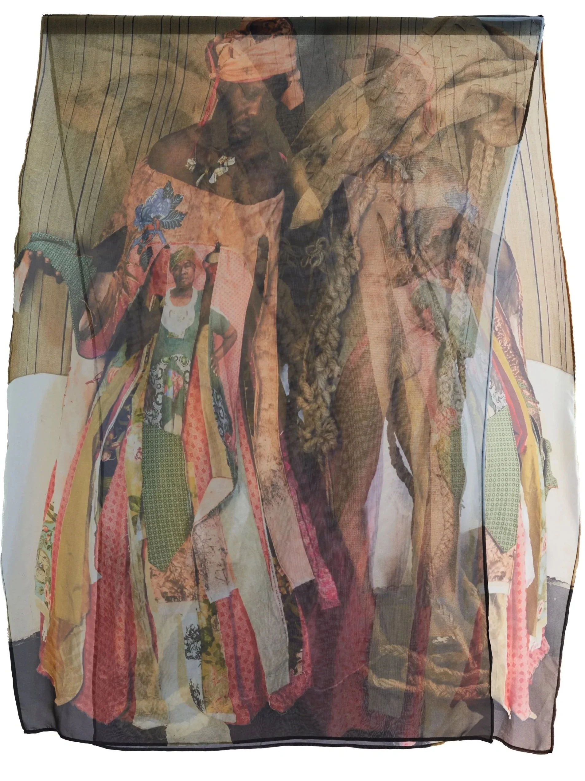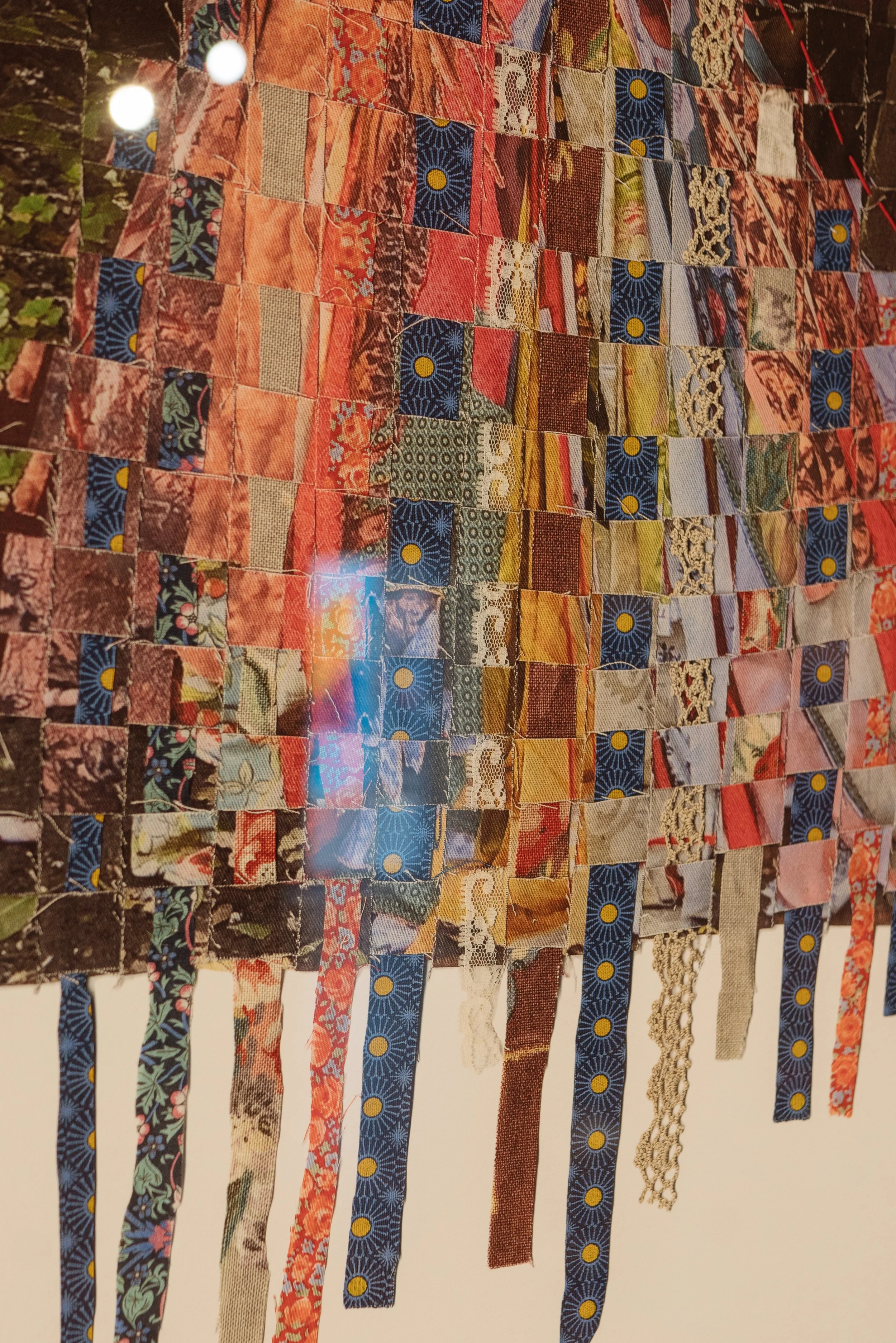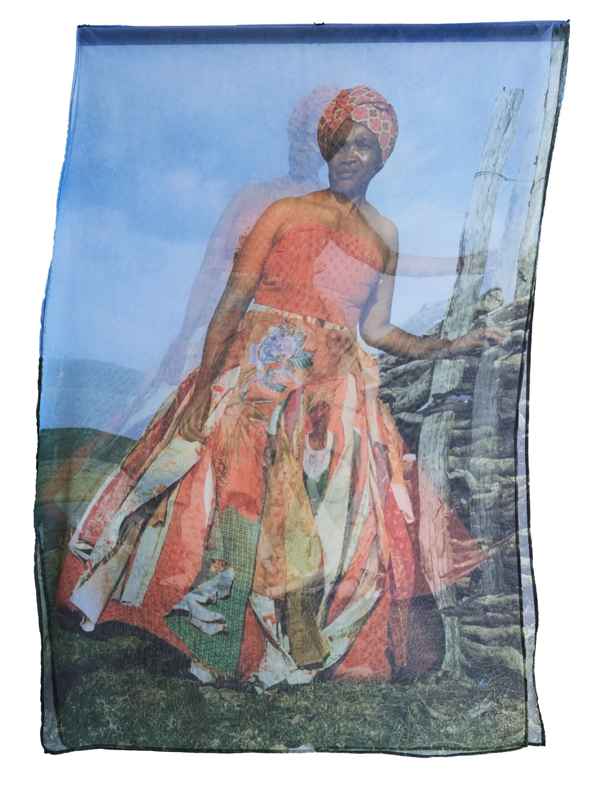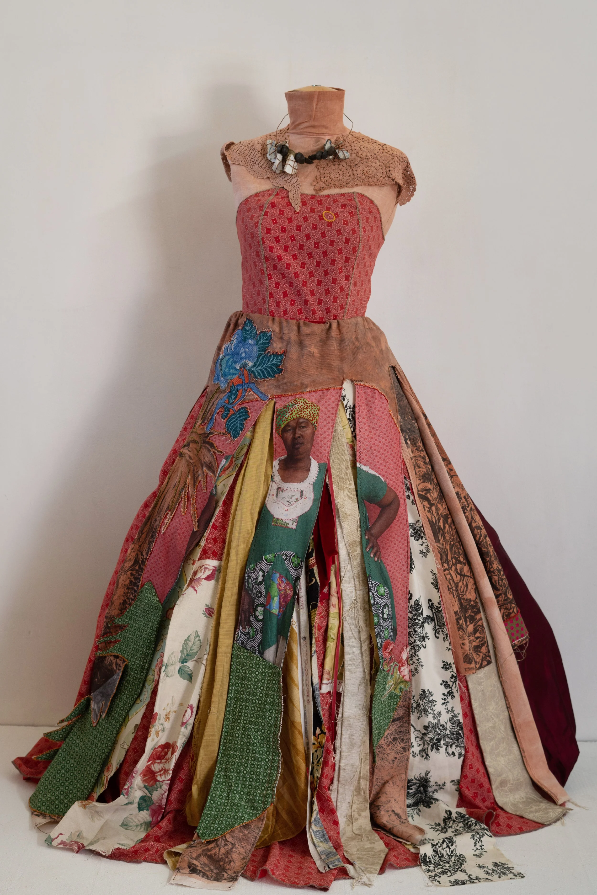 Interlaced moves the personal into the communal, weaving together what has been inherited, suppressed, and shared. African shweshwe and colonial English fabric sit alongside one another; a necklace of found shards of British crockery and military buttons from the Eastern Cape, the land of my colonial forebears, holds the tension between histories that do not easily reconcile. We are a collage of stories, a matrix of past, present and future, womb-like and interwoven. Once repressed trauma is brought into the open and shared, it becomes shot through with light, a kaleidoscope of shifting meanings. The photographic surfaces reflect this: images that dissolve and fragment, like a face seen in moving water. As each person inhabiting the dress voices their truth, something shimmers.... an ephemeral collision of you and I, then and now, a glimpse of something almost remembered.