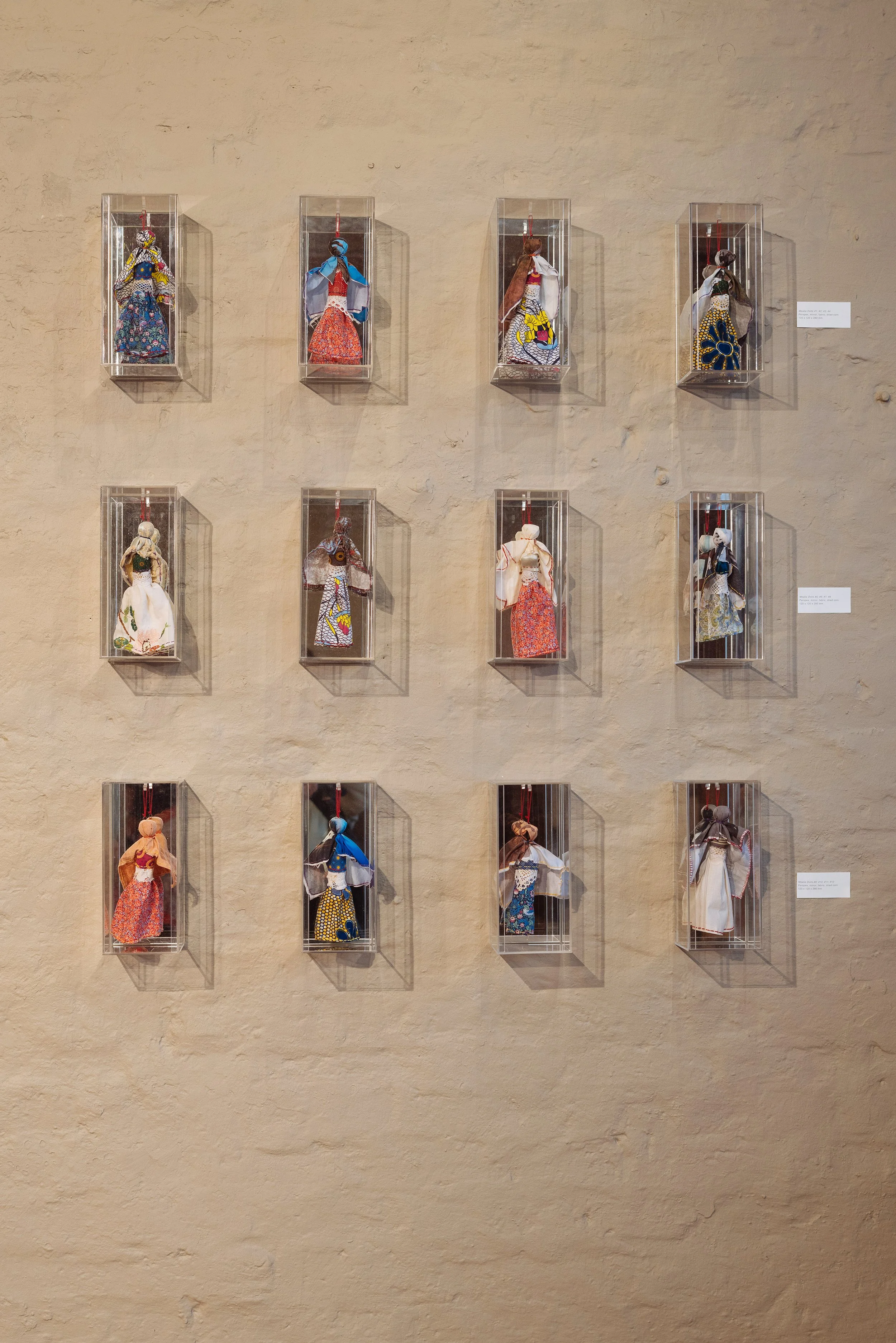Mielie Dolls begins with a childhood memory: visits to my grandparents' farm, where my nanny Angelina, a steady, comforting presence, taught me to make dolls from corncobs dressed in scraps of old fabric. Angelina's hands guided mine, and the dolls I made were given to my blind grandmother to hold, passed between hands, seen through touch, known through texture and form. That memory stayed beneath the surface for decades, returning only in my fifties with new weight and clarity, prompting me to remake them.
